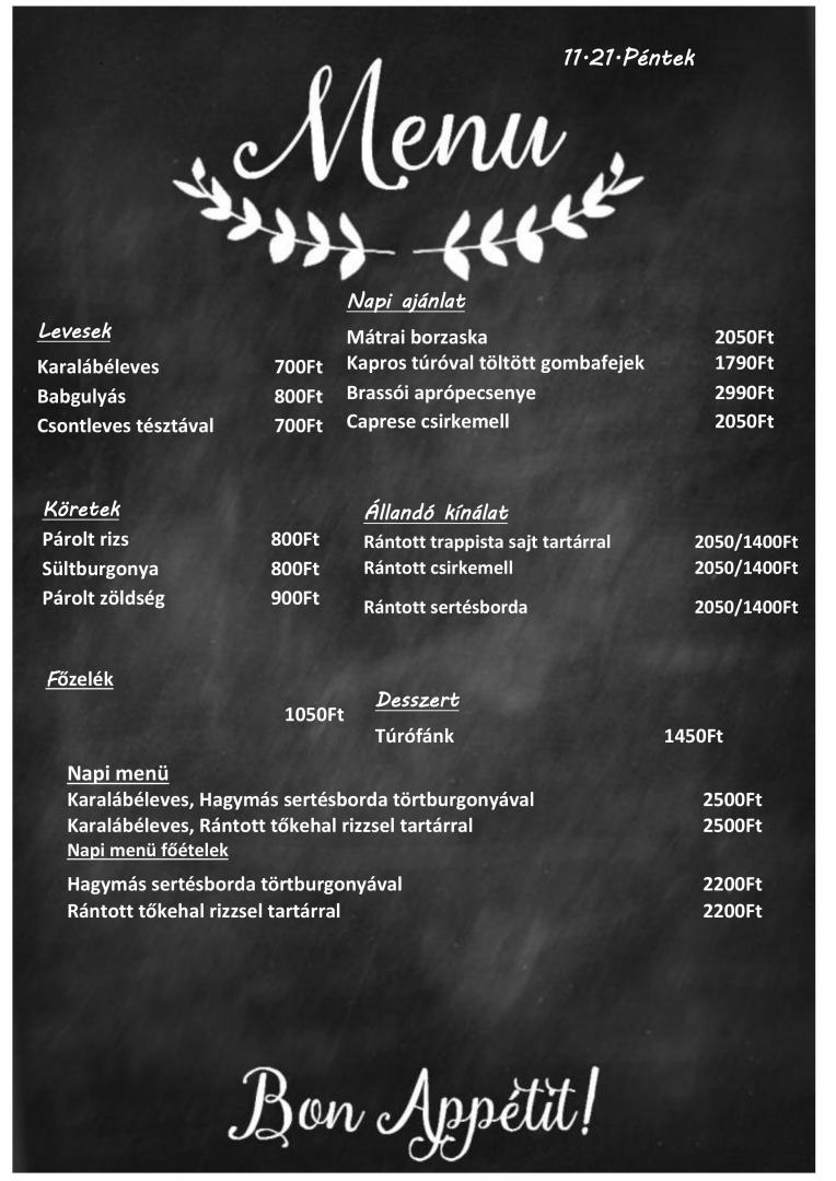 Célunk, hogy vendégeink otthonosan érezzék magukat, még a munkahelyi környezetben is. Napi ajánlataink között megtalálhatók a házias ízek, könnyed reformételek, paleo fogások, frissensültek, levesek, halételek, saláták és házi desszertek.